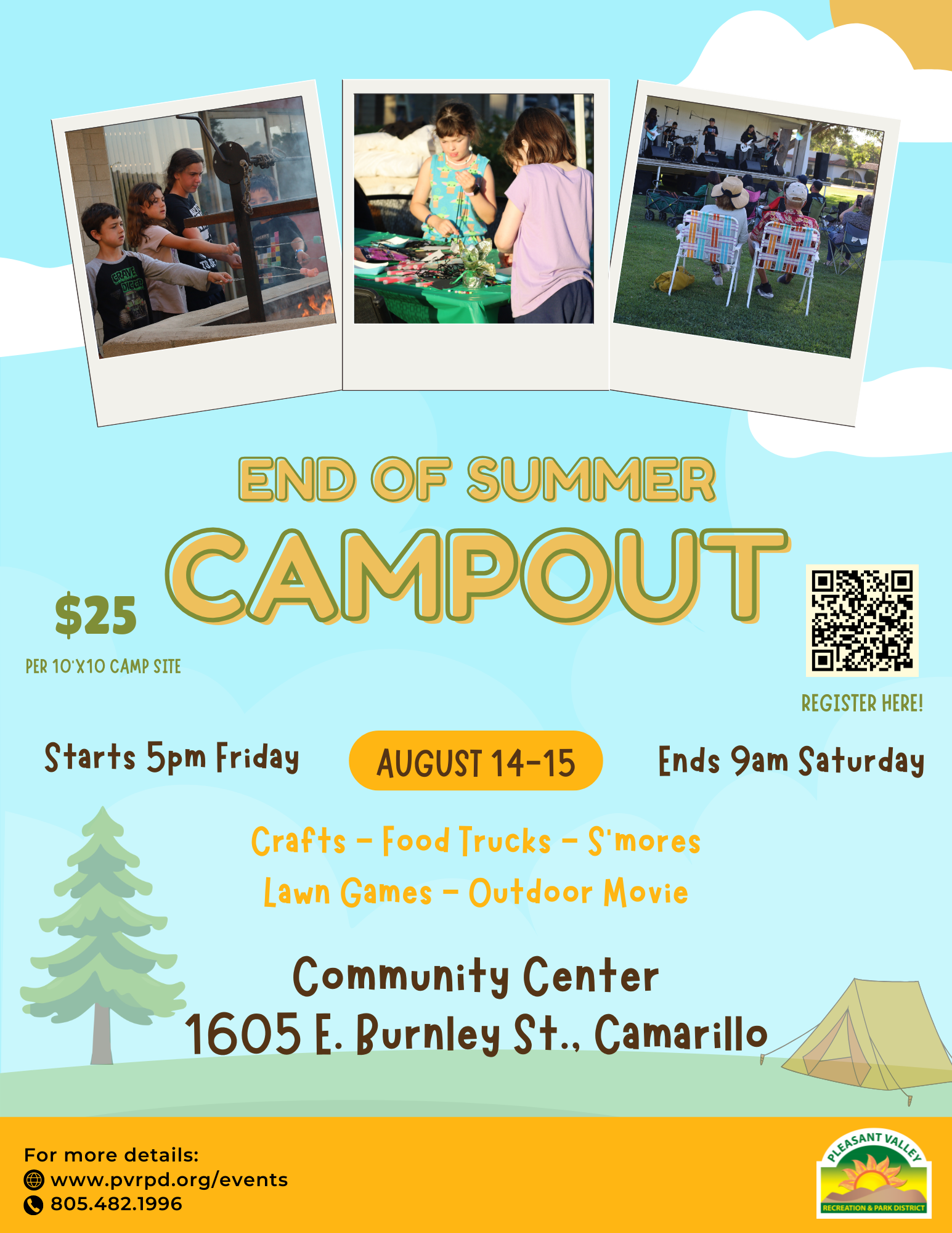End your Summer with this fun-filled annual tradition! Bring your family and friends for a one night campout at Community Center Park. Bring your own tent, sleeping supplies, and food you wish to enjoy. We will provide the rest!