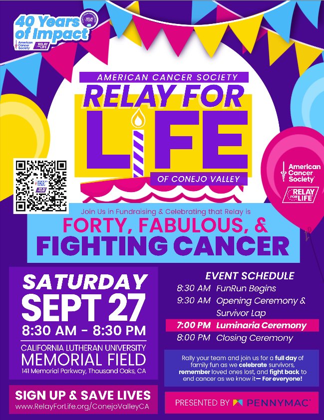 2025 marks the 27th year of Relay For Life in Conejo Valley and the 40th anniversary since the very first Relay For Life took place in Tacoma, WA! As such, this year, we’re celebrating Relay is “Forty, Fabulous, and Fighting Cancer”!