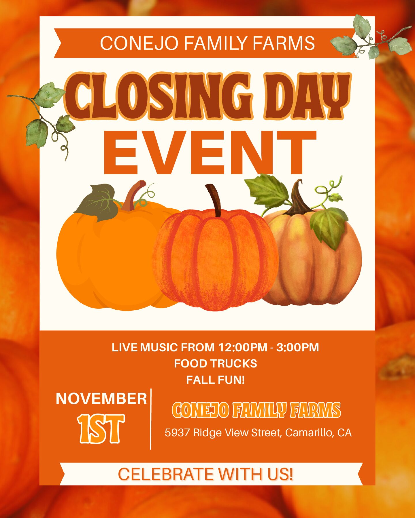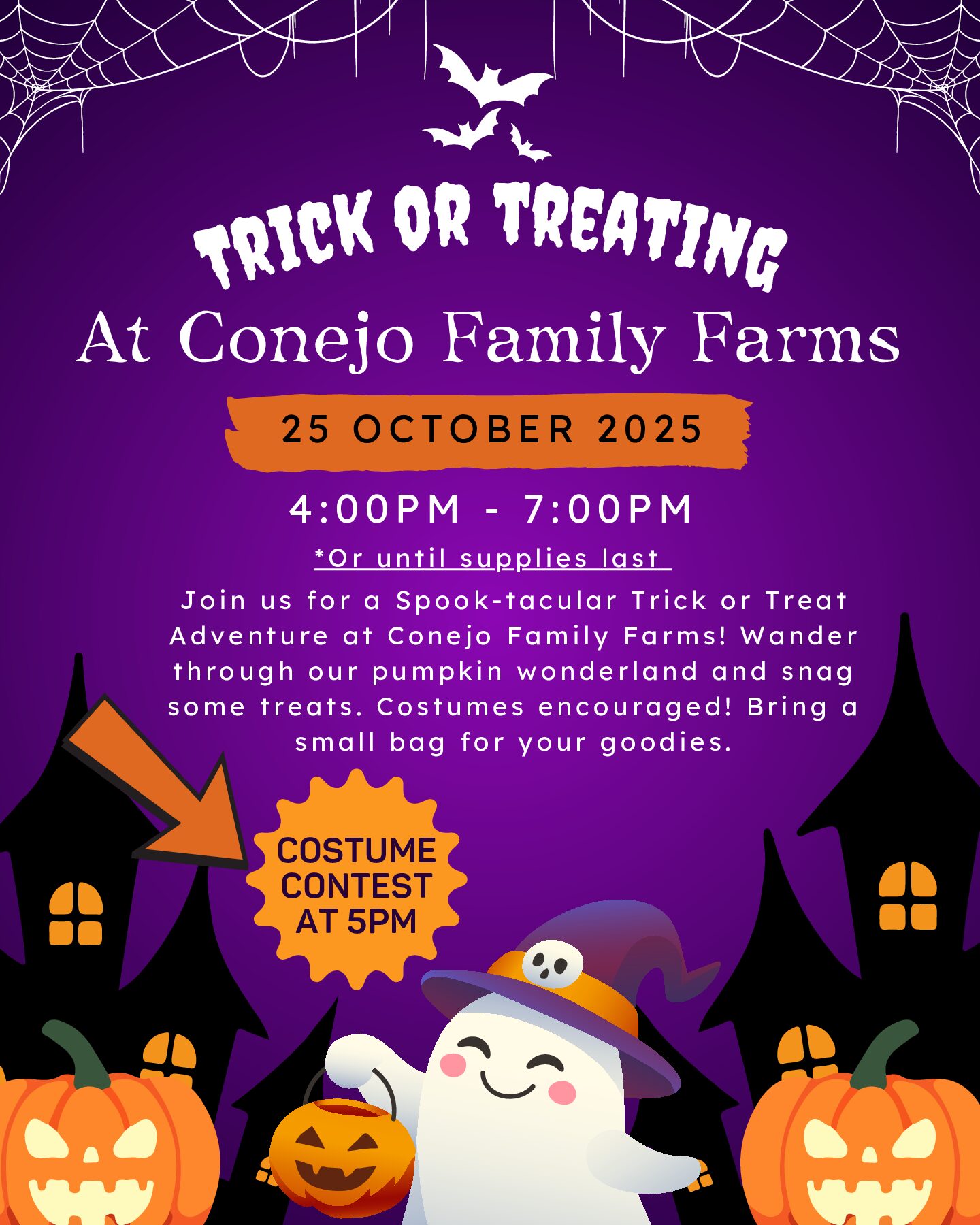 Conejo Family Farms 5937 Ridge View StreetJoin us for a Spook-tacular Trick or Treat Adventure at Conejo Family Farms! Wander through our pumpkin wonderland and snag some treats. Costumes encouraged! Bring a small bag for your goodies. We will be hosting a costume contest at 5:00pm. Please meet by the big white wall at 4:30pm if you would like to enter.